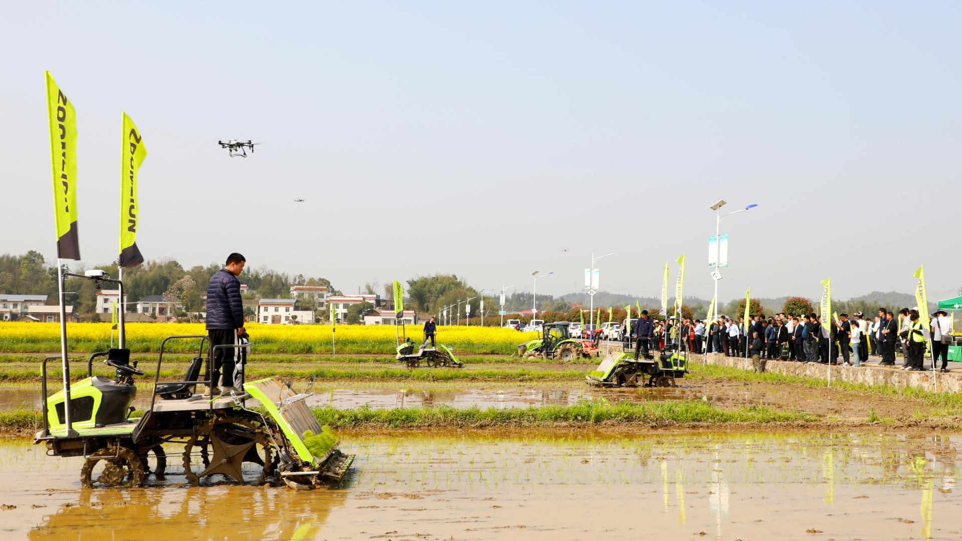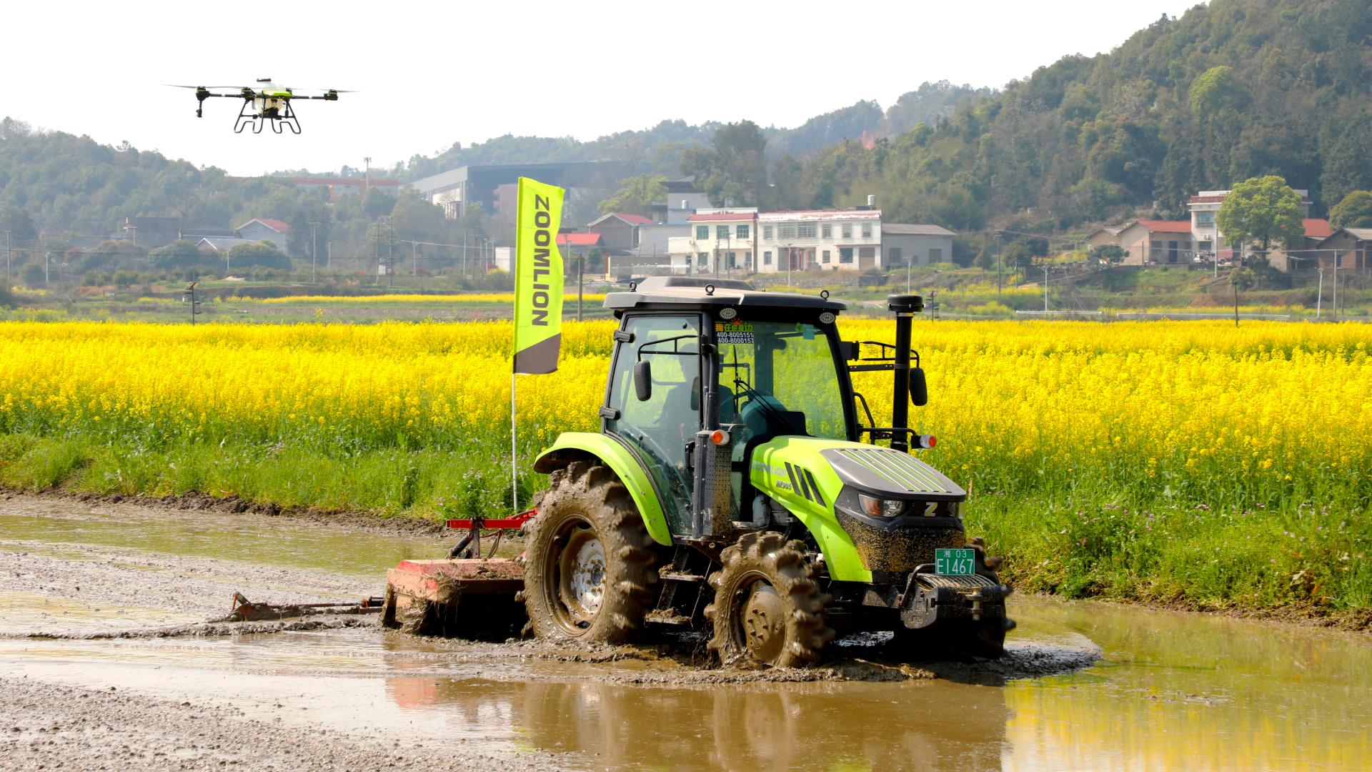 田地間,中聯(lián)重科水田拖拉機(jī)和履帶式旋耕機(jī)開足馬力開展耕整作業(yè),改善土壤結(jié)構(gòu)與肥力,為后續(xù)水稻種植做好準(zhǔn)備;搭載“中聯(lián)智駕”系統(tǒng)的水稻插秧機(jī)按照規(guī)劃線路自動(dòng)行駛,在“北斗”定位技術(shù)的加持下,實(shí)現(xiàn)厘米級(jí)精準(zhǔn)插秧作業(yè),為水稻插秧環(huán)節(jié)提供更智慧的解決方案;中聯(lián)重科植保無人機(jī)騰空而起,靈活盤旋在農(nóng)田上空進(jìn)行施肥作業(yè)。“耕、種、管”智慧無處不在,助力春耕提質(zhì)增效。