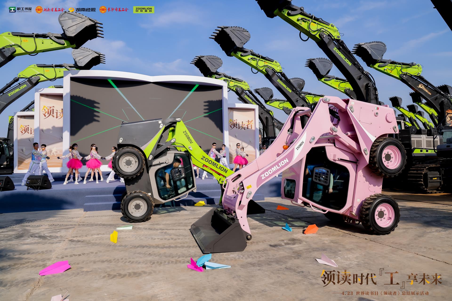 陽光下,中聯重科智慧產業城內,一臺臺挖掘機整齊排列、環繞舞臺,展現工業與科技的結合之美。中國工程院院士、茶學專家、湖南師范大學校長劉仲華,中國作協主席團委員、湖南省作家協會原主席、作家王躍文,湖南省音樂家協會理事、知名音樂人袁樹雄,與勞模代表、工匠“領讀者”紛紛走上舞臺,通過書籍分享、情景講述、詩詞吟誦、歌舞表演等形式,呈現一場屬于所有職工的閱讀視聽盛宴。